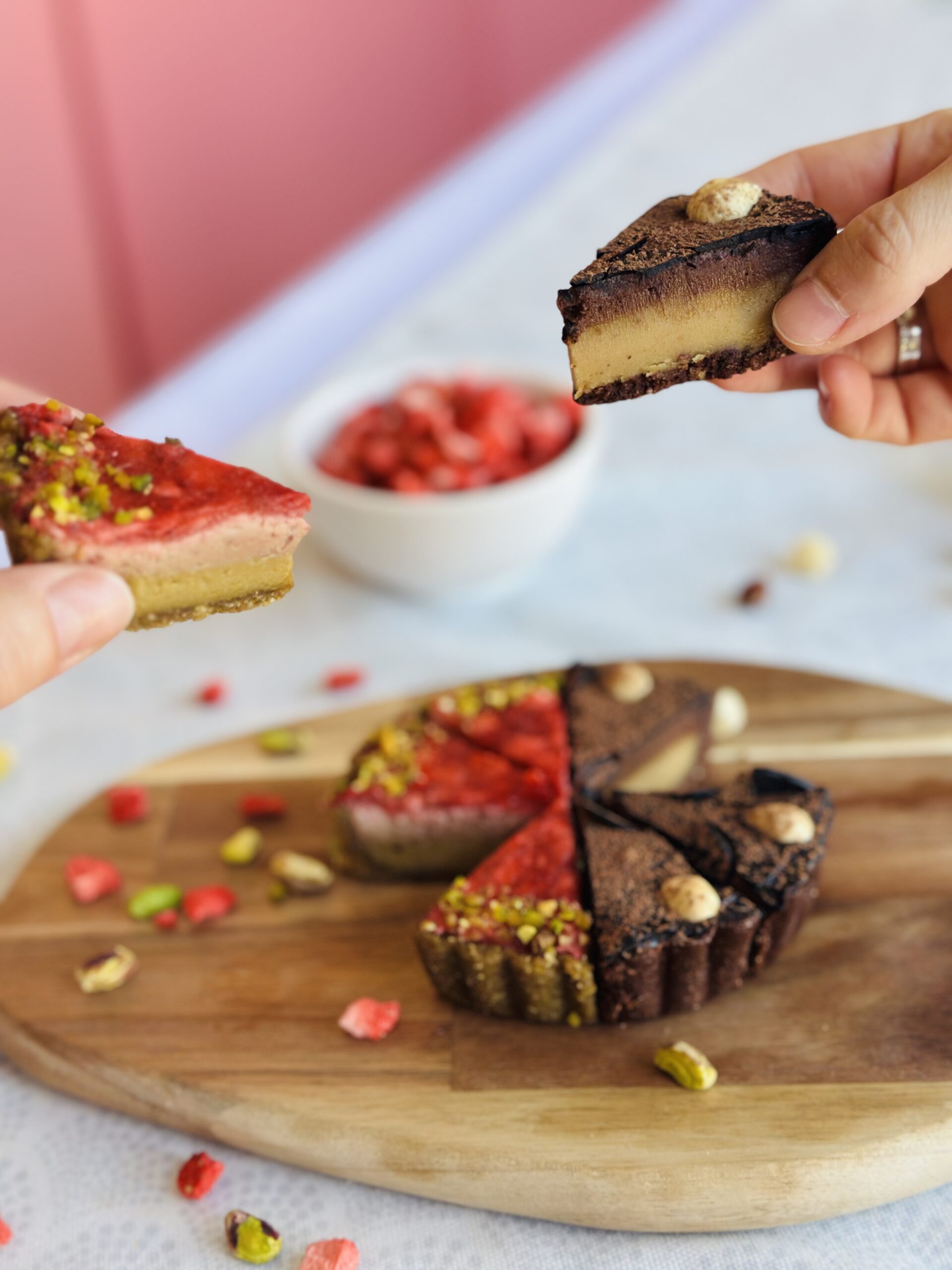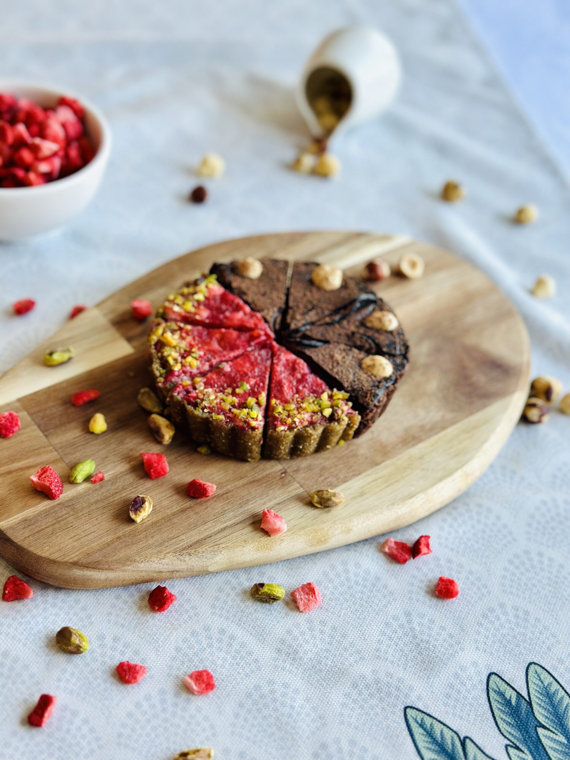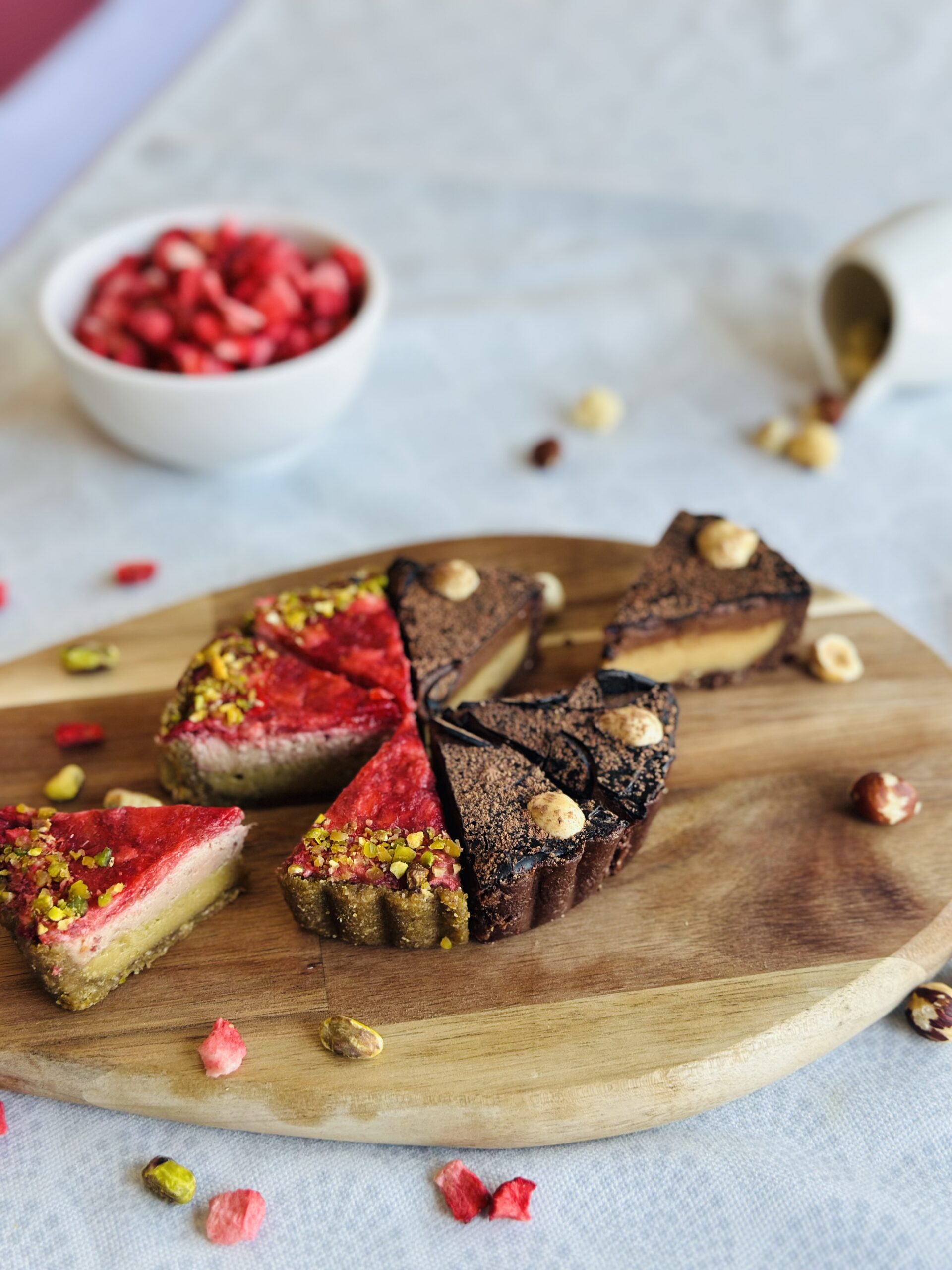 Naši tartovi se ne peku i ne sadrže margarin ni puter, već kokosovo ulje i kakao puter zbog čega se kao i sve raw tj. sirove torte brže tope. Kako bi zadržali formu i sve hranljive materije zamrzavamo ih u procesu proizvodnje.
